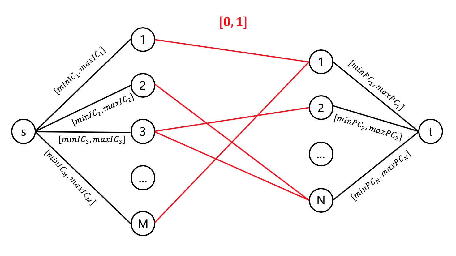 $i$번째 IC 학생이 원하는 데이트의 최소 횟수를 $minIC_i$, 최대 횟수를 $maxIC_i$로 표기하자. 비슷하게 $minPC_j$와 $maxPC_j$를 정의하자. 그러면, 이 문제는 아래와 같이 간선을 지나가는 유량의 최소 제한과 최대 제한이 있는 플로우 그래프로 모델링 가능하다.