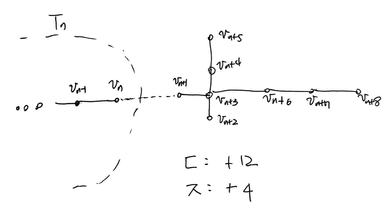 이런 류의 구성적인 문제는 전형적이게도 수학적 귀납법을 생각해볼 수 있다. 나는 명제를 "크기가 $n$이고, 차수가 2, 1인 정점이 연속해서 나오는 DUDUDUNGA 트리를 만들 수 있다."로 강화후, 아래 그림과 같은 induction step을 이용하여 문제를 풀었다. (사실 이 부분이 나는 굉장히 straightforward 하다고 생각하는데, 다른 분들의 난이도 평가를 보면 그러지 않은 것 같기도 하다.)