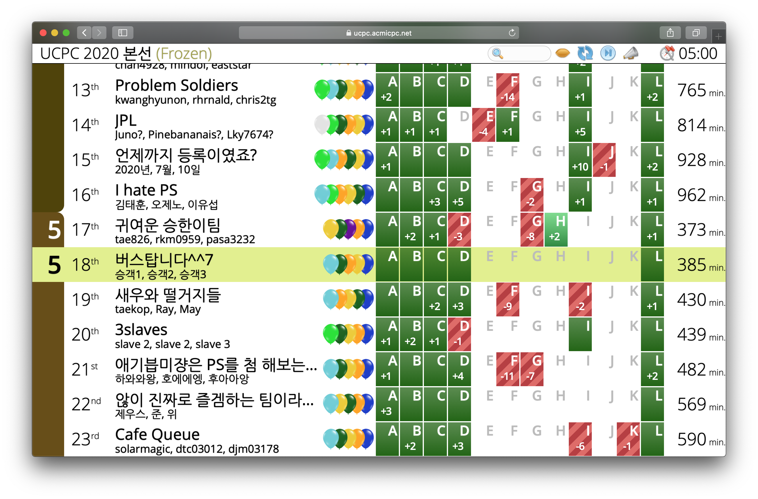 결국 5솔브 / 385 min. 으로 마무리하며 전체 18위를 하게 되었다. 15위 까지 시상하는데, 통한의 5솔브 벽을 넘지 못했다는 점이 다소 아쉽긴 했지만, 더 보완하면 ICPC 때는 더 좋은 결과를 낼 수 있지 않을까 조금은 기대하게 되는 것 같기도.