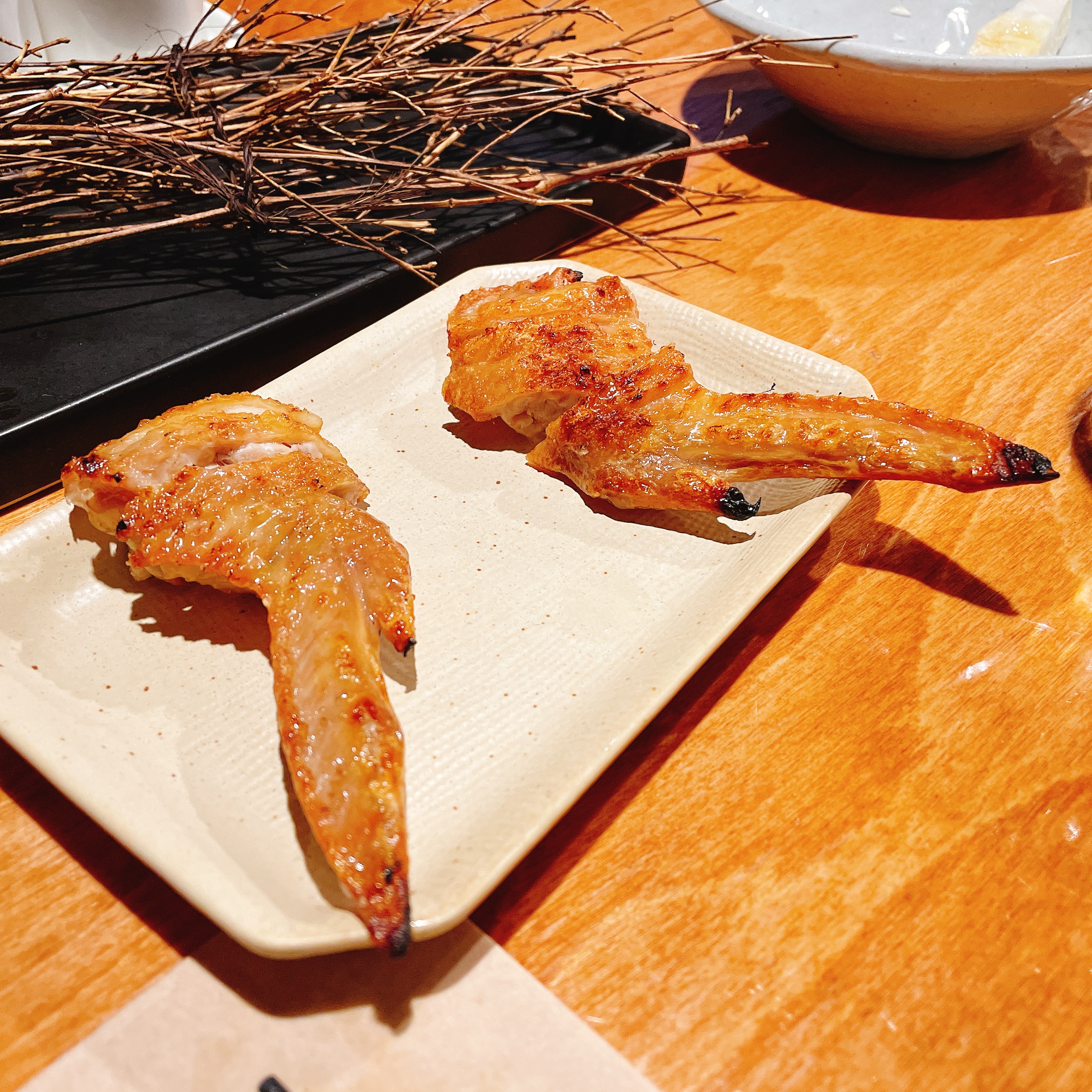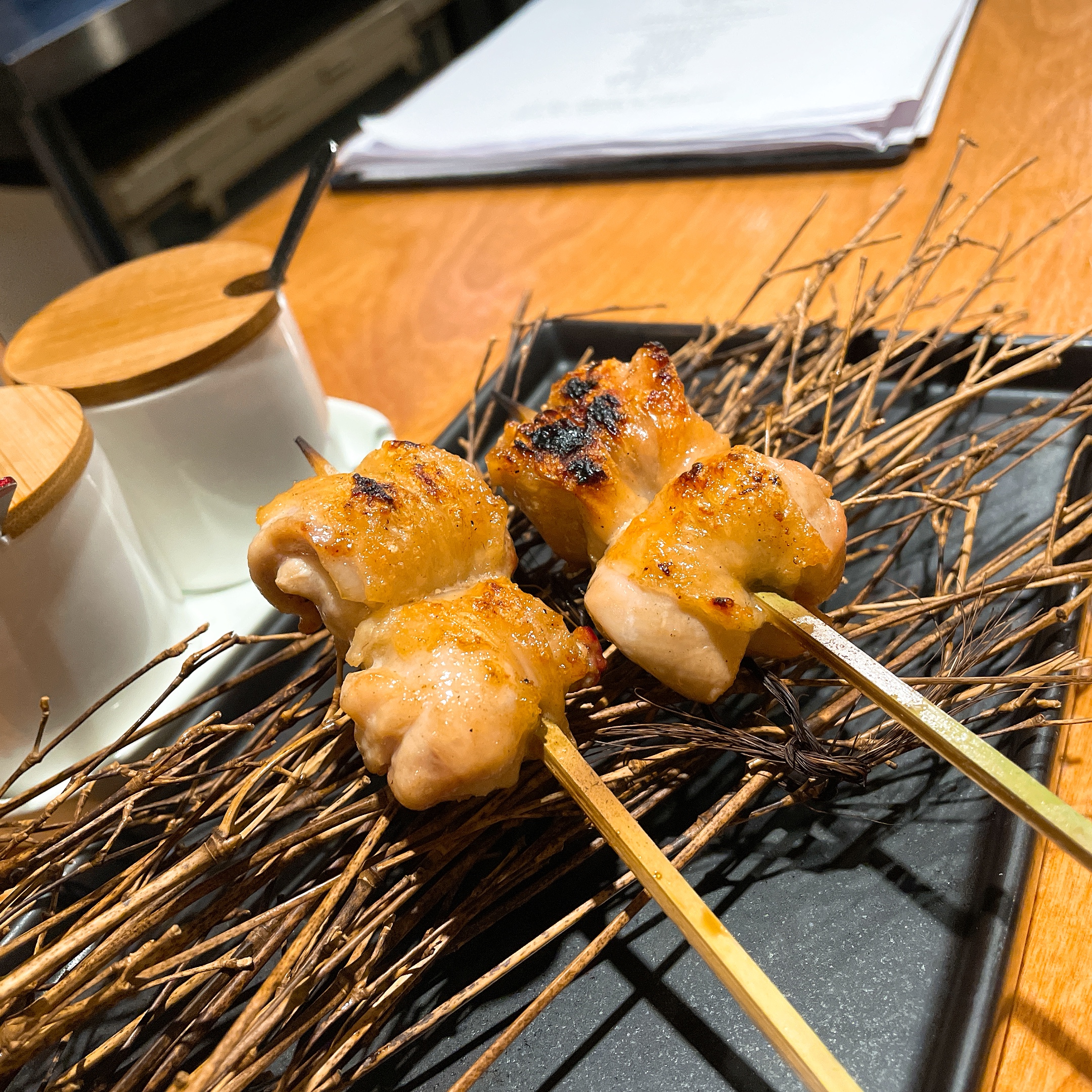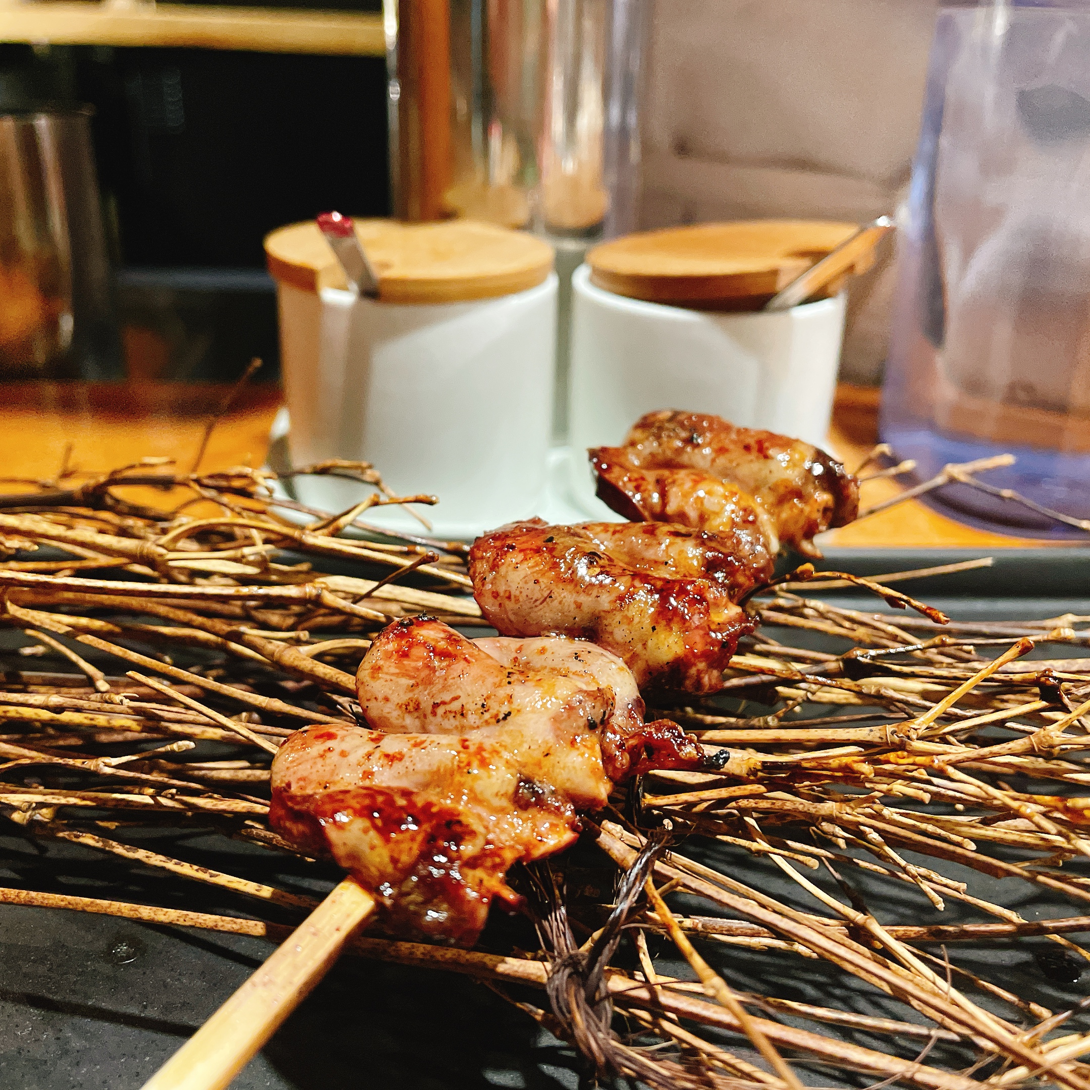 자리에 처음 앉았을 때 세팅은 이렇게 되어 있었다. 볏짚이 올려진 접시 위에 꼬치류가 나온다. 내 친구들 중 술을 정말 좋아하는 개발자 친구 한 명이 있는데, 그 친구와 같이 갔었다.