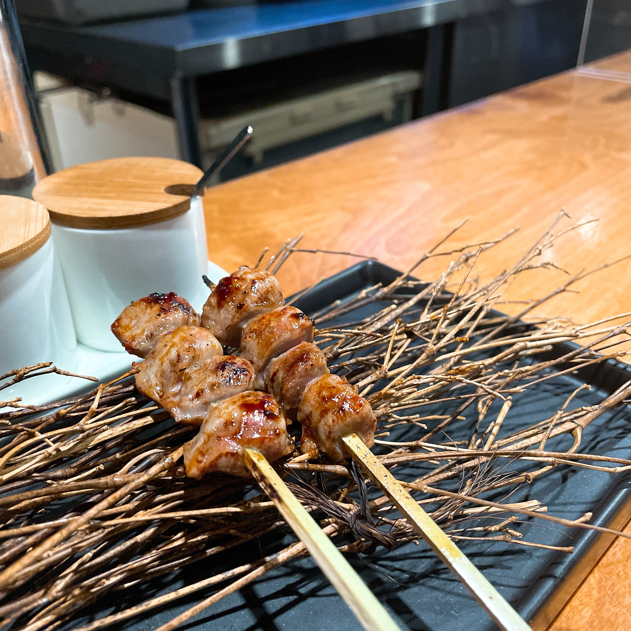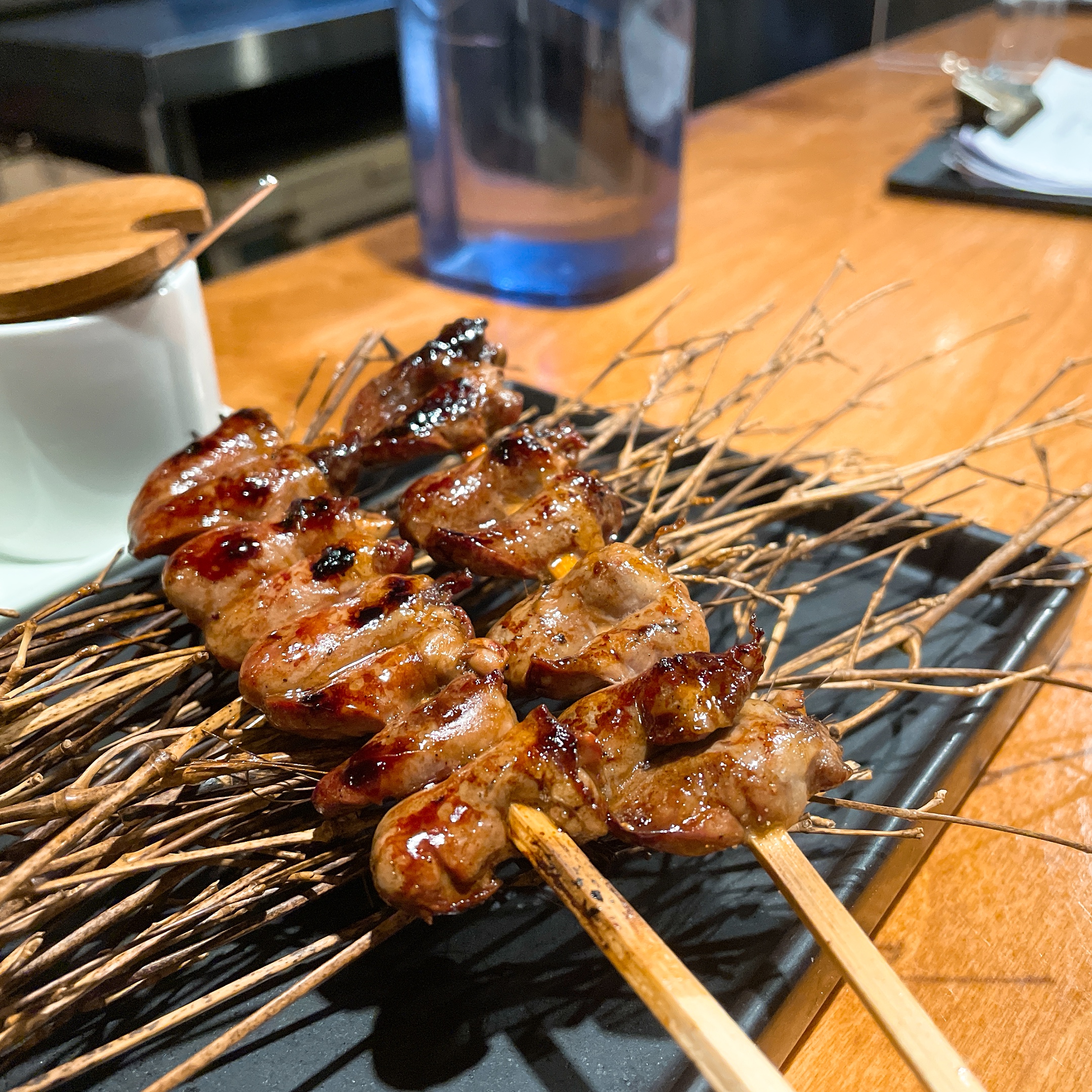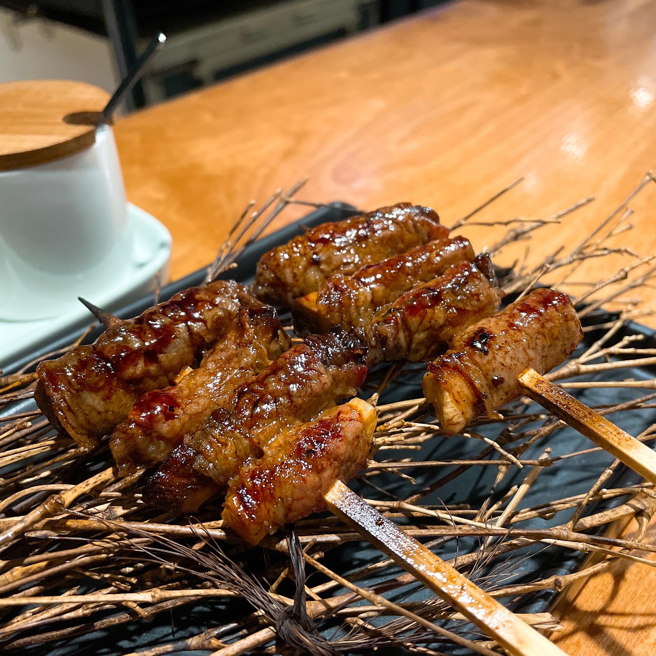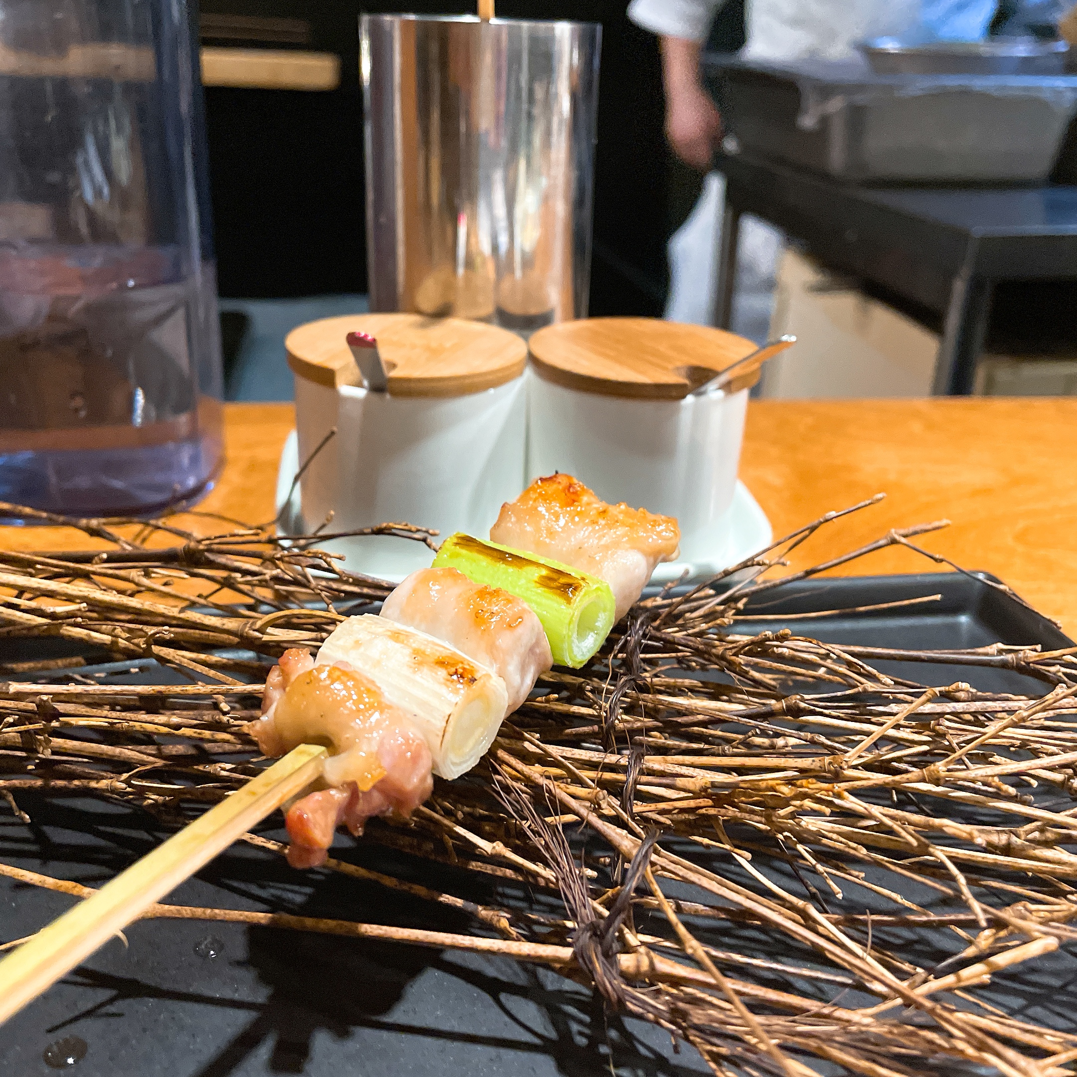 자리에 처음 앉았을 때 세팅은 이렇게 되어 있었다. 볏짚이 올려진 접시 위에 꼬치류가 나온다. 내 친구들 중 술을 정말 좋아하는 개발자 친구 한 명이 있는데, 그 친구와 같이 갔었다.