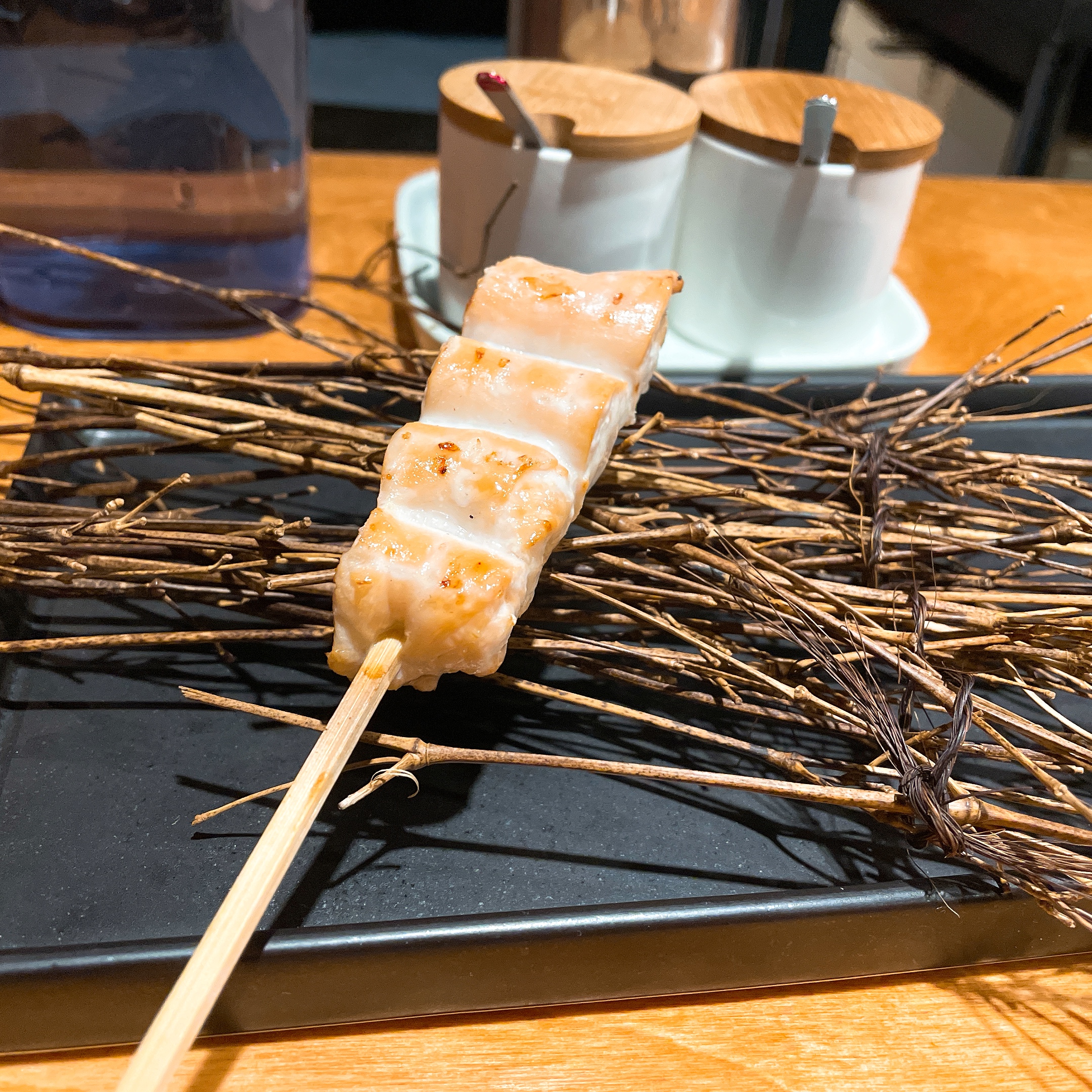 자리에 처음 앉았을 때 세팅은 이렇게 되어 있었다. 볏짚이 올려진 접시 위에 꼬치류가 나온다. 내 친구들 중 술을 정말 좋아하는 개발자 친구 한 명이 있는데, 그 친구와 같이 갔었다.