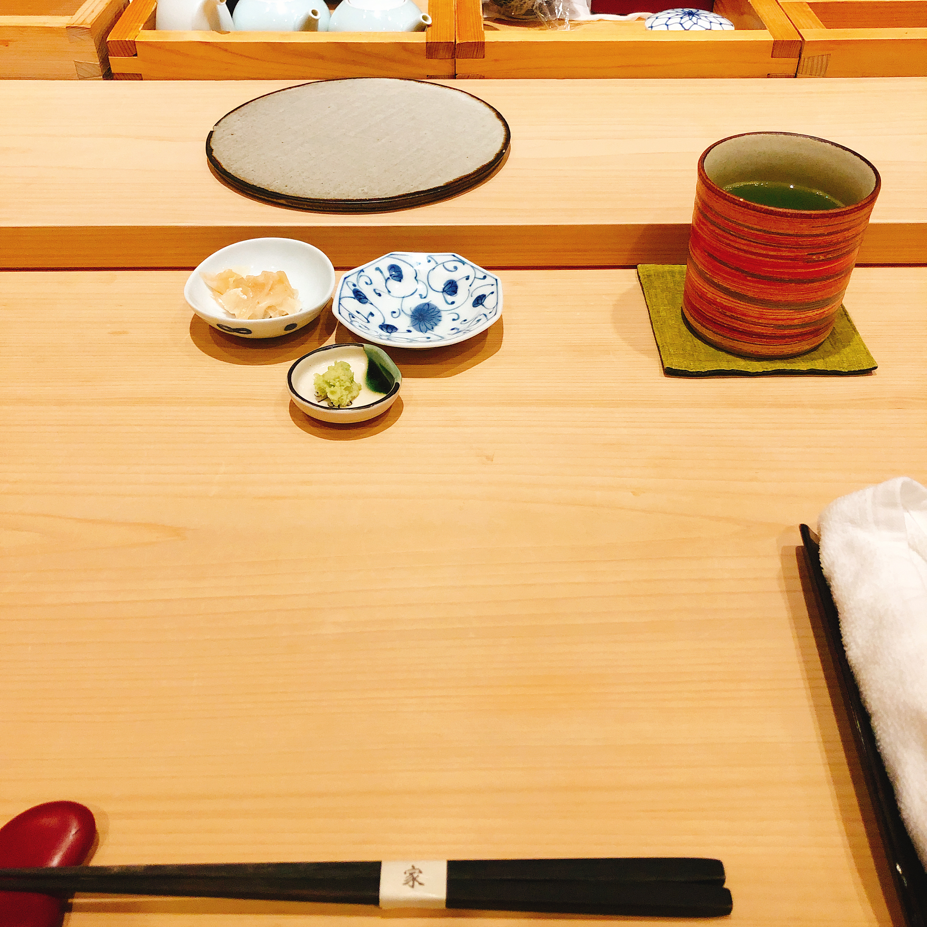 코스 시작 전에 자리는 이렇게 세팅되어 있었다. 이 날은 술을 먹지 않기로 해서 와인을 들고가지 않았는데, 나중에 크게 후회했다. 샴페인 같은거 두어 병 콜키지 하기 좋으니, 이 글을 보고서 분당 스시야에 가게 된다면, 꼭 콜키지 하기를 추천한다.
