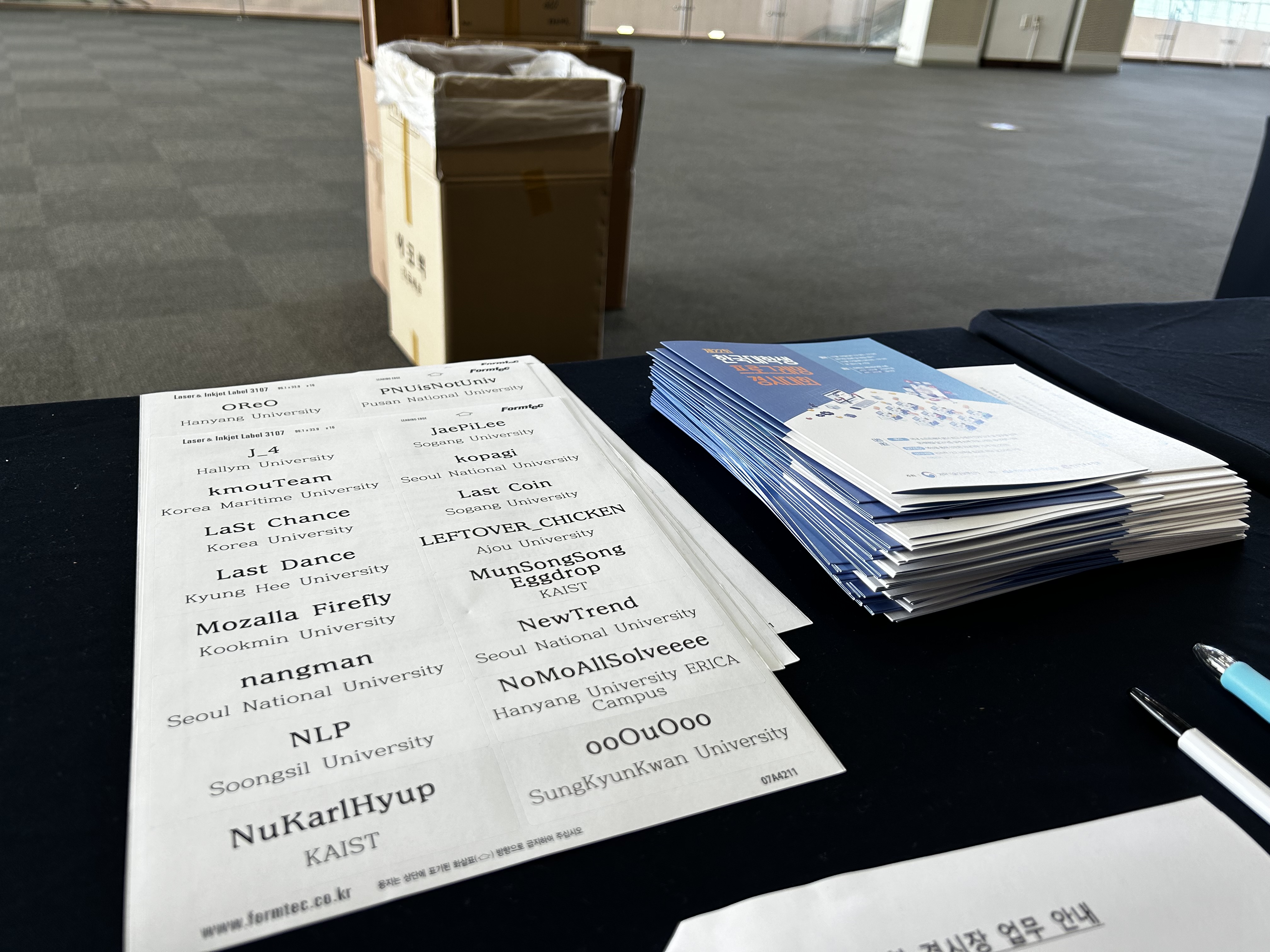 대회장에 도착하고서는 간단한 오리엔테이션을 받고, 참가 등록을 받기 전에 해야 할 수작업들을 진행했다. 수작업들 중 가장 중요한 건 각 팀이 수령할 패키지를 만드는 것인데, 하나의 패키지는 다음과 같이 구성된다.