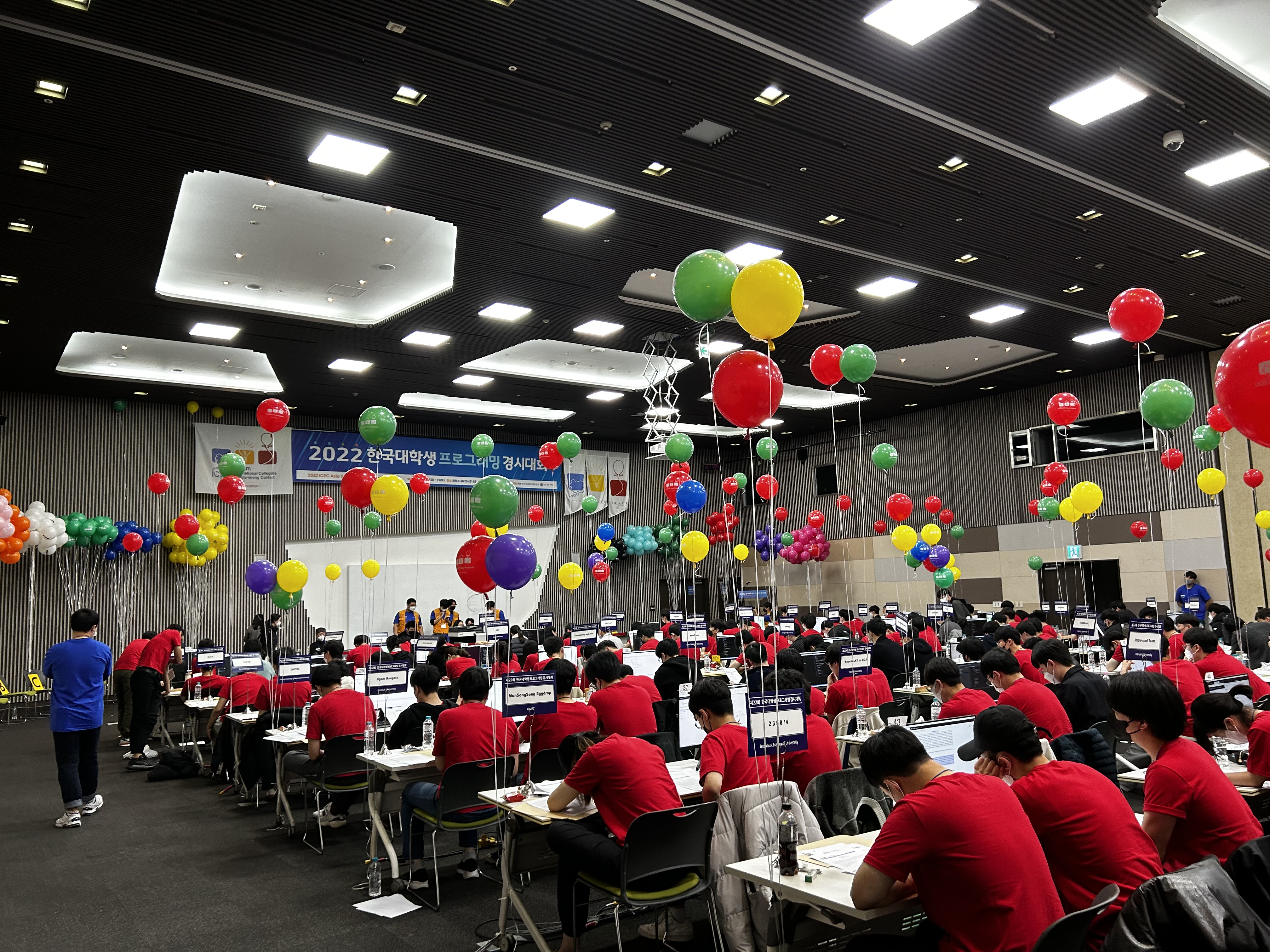 2일차에는 아침 이른 시각부터 일정이 진행되었다. 나와 준원이는 호텔 조식을 예약해놨었는데, 이게 취소가 안 되어서(...) 조식을 10분 컷 하고 행사장으로 달려갔다. 등록 데스크에서 여러 팀들이 등록하는 동안, 우리는 각 팀이 앉을 자리에 맞춰 팀노트를 배부하고, 각 문제를 맞힌 팀에게 배부할 풍선을 준비했다. 등록에 굉장히 늦게 온 팀들이 있었던 것으로 기억하는데, 이왕이면 시간을 잘 지켜줬으면 어땠을까 하는 아쉬움이 있었다.