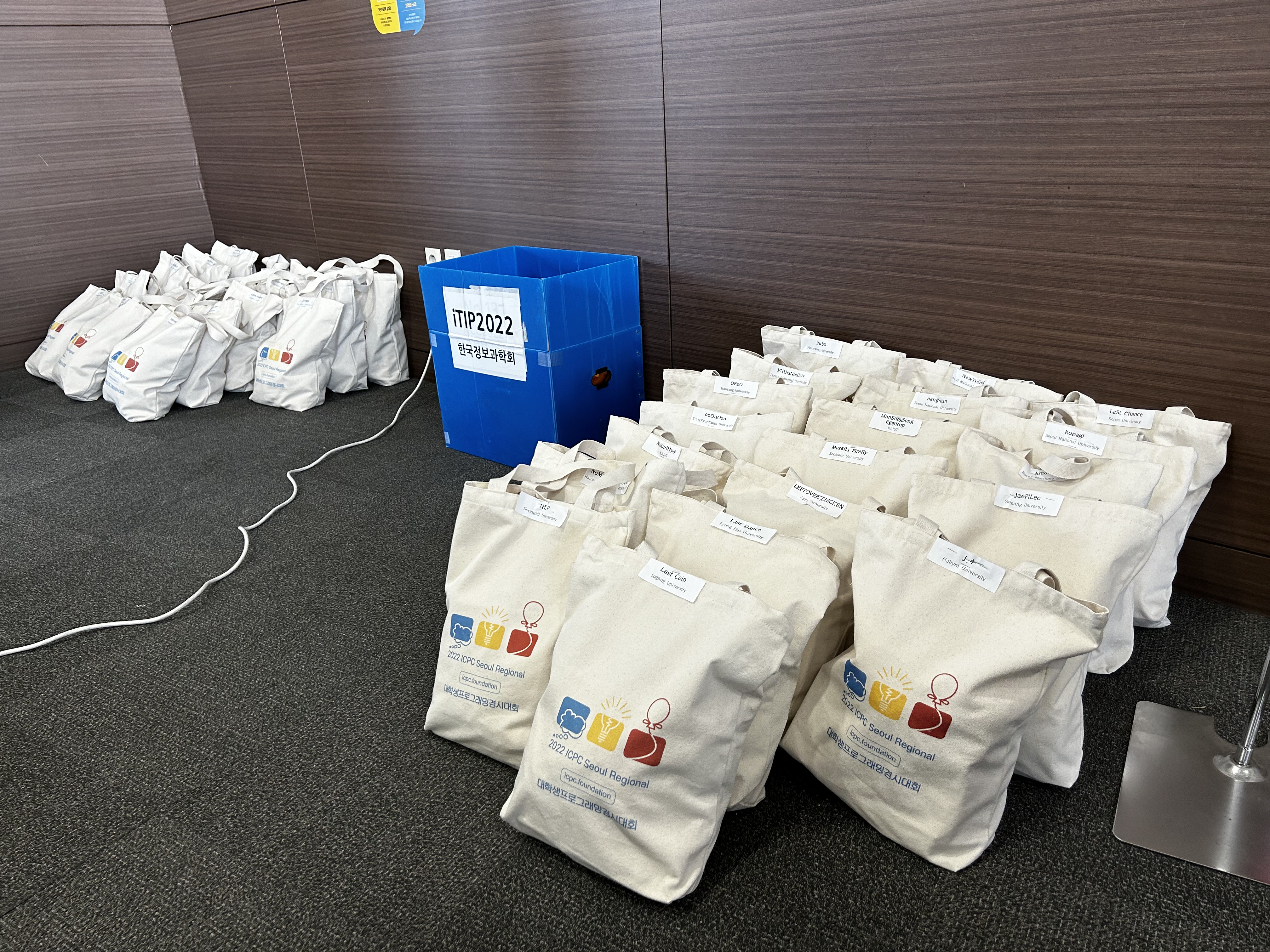 대회장에 도착하고서는 간단한 오리엔테이션을 받고, 참가 등록을 받기 전에 해야 할 수작업들을 진행했다. 수작업들 중 가장 중요한 건 각 팀이 수령할 패키지를 만드는 것인데, 하나의 패키지는 다음과 같이 구성된다.