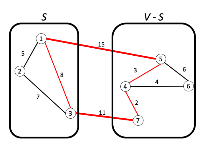 임의의 cut set $D$에 대해 $D$에서 가중치가 가장 작은 간선 ($\mathrm{argmin}_{e \in D} w(e)$) 은 모든 MST에 반드시 포함된다.