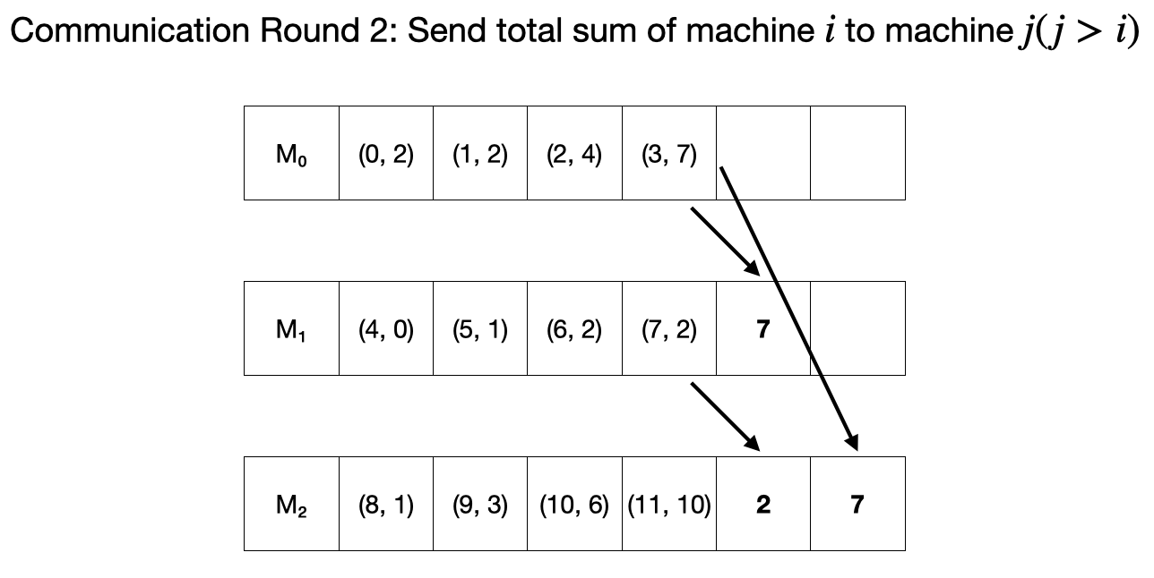 두 번째 round에서 각 머신은 먼저 자신이 들고 있는 원소들의 총 합을 자신보다 인덱스가 큰 다른 머신에 보낸다.