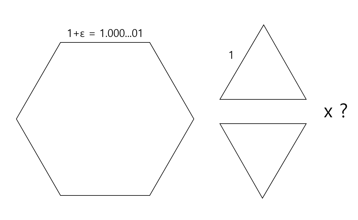 한 변의 길이가 1+ε이고, 아랫변과 윗변이 x축에 평행하게 놓인 정육각형을 한 변의 길이가 1이며 세 변 중 하나가 x축에 평행한 단위 정삼각형으로 덮는 상황을 생각해보자. (아래 그림과 같이 두 종류의 정삼각형이 있을 것이고, 반드시 각 정삼각형의 한 변은 x축과 평행해야 한다.) 이 때 최소 몇 개의 정삼각형이 필요할까? (정삼각형 끼리 겹치는 것은 허용된다. 즉, packing이 아닌 covering 문제다.)