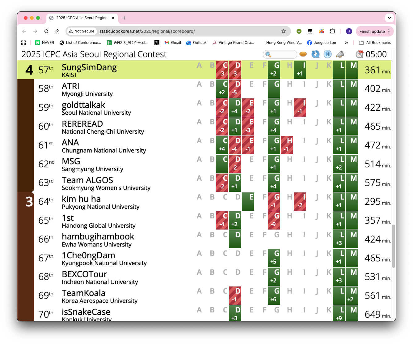 어찌 됐든 나의 마지막 ICPC는 끝났고, 우리팀은 57등으로 마무리했다. 아쉬운 결과이지만, 지나간 일은 털어버리는게 맞다고 생각한다. 다음 주에 팀원들에게 저녁을 한 번 사기로 했다.