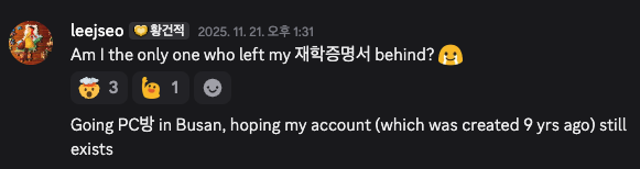 부산에 도착했는데 재학증명서를 안 가져왔음을 깨달았다. 내가 원래 약간 관종이라, RUN 디스코드에 약간의 어그로를 끌었다. 그런데 나만이 아니어서, octane의 재학증명서도 같이 인쇄해서 들고갔다. 아쉽게도 계정 아이디/비밀번호가 안 맞아서 비회원 요금을 지불했다.