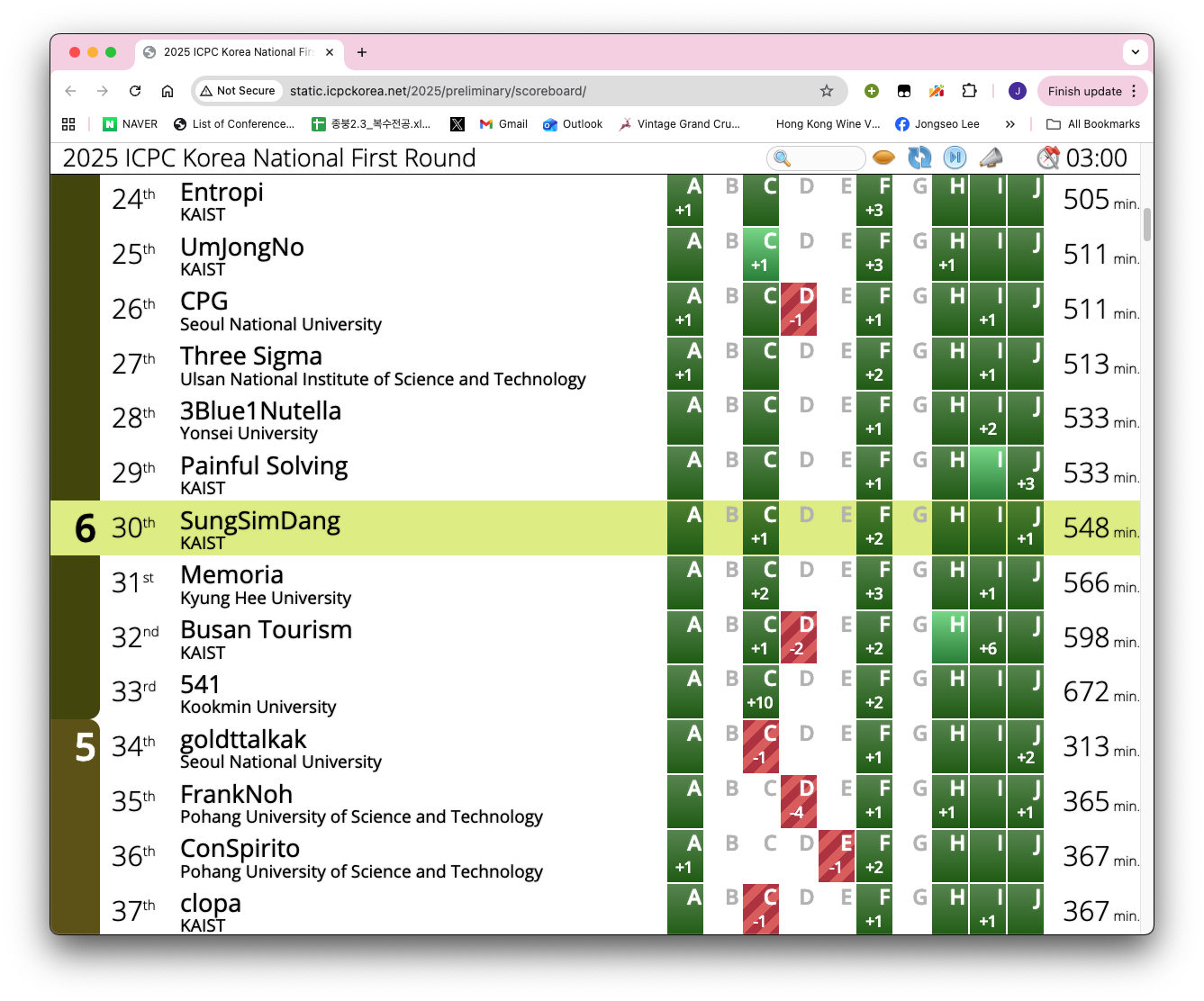 이후 D번을 고민하다가 대회가 끝났고, 6솔브한 팀이 되게 많은 것 같아서 걱정을 했지만 의외로 넉넉하게 본선에 진출했다. 이런저런 아쉬움은 있었지만, 다행이었다.